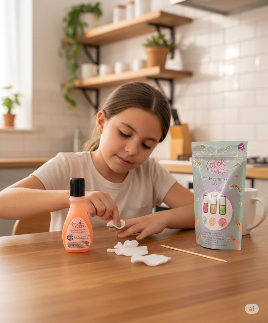 Su fórmula sin acetona e hipoalergénica retira el esmalte de manera efectiva, cuidando la delicada piel y uñas de chicos y grandes.